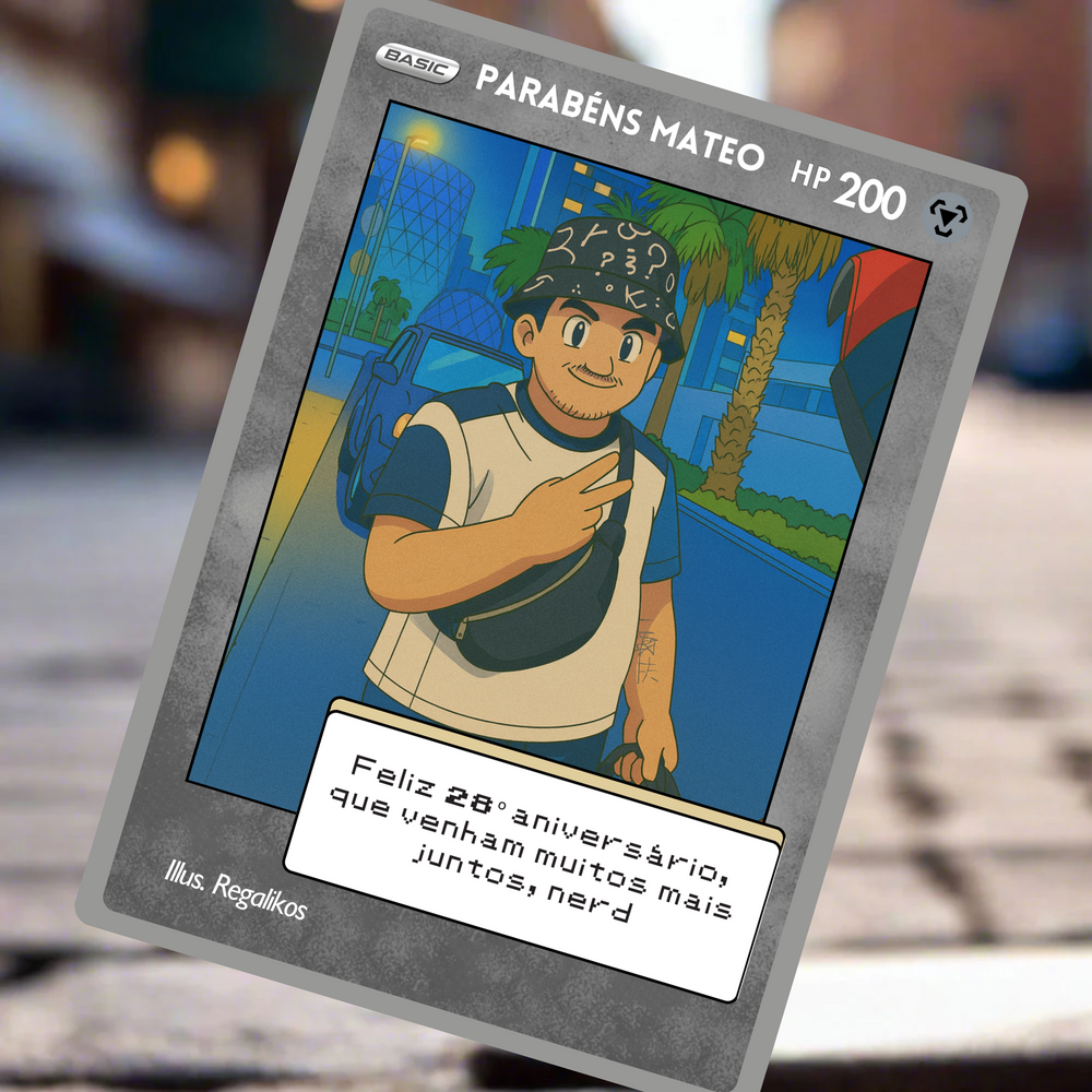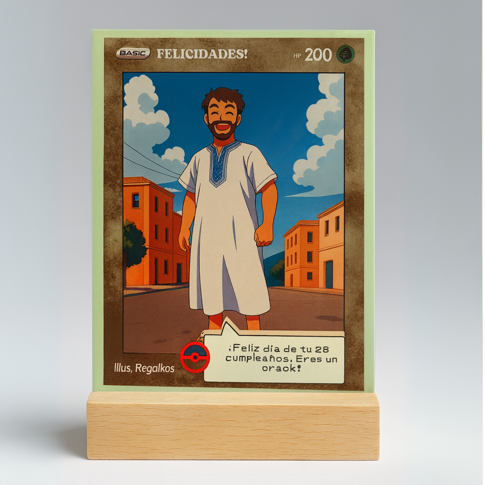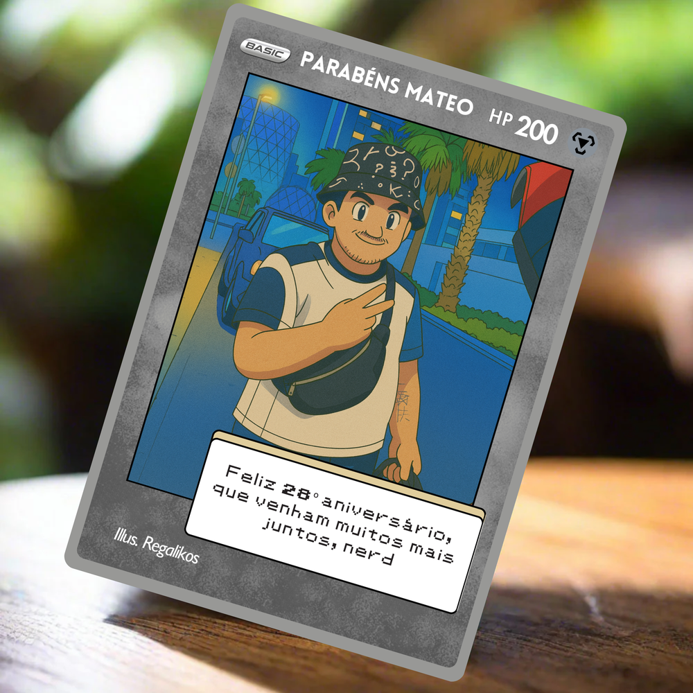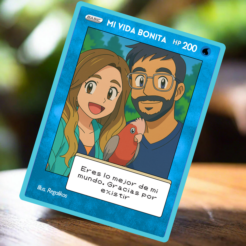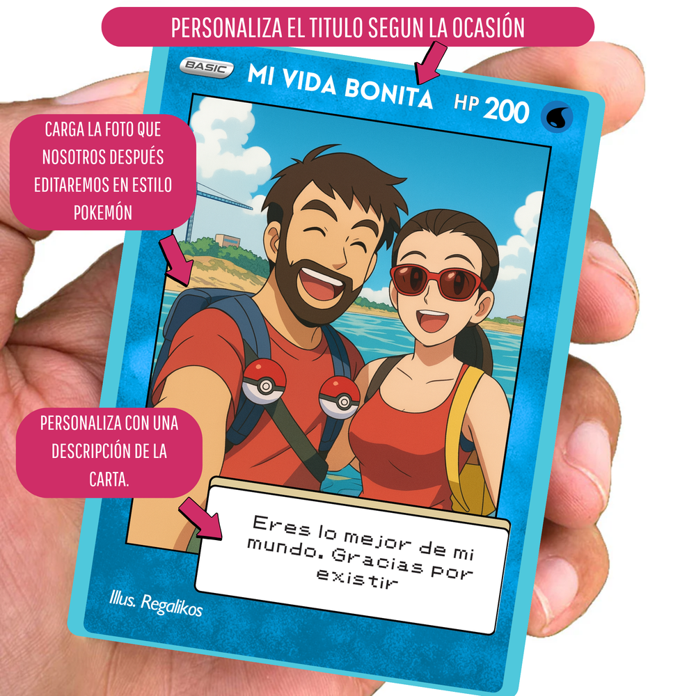Puedes personalizarla con el nombre, una frase divertida o romántica, y hasta una dedicatoria secreta, al más puro estilo de las cartas más míticas del universo Pokémon. Con un diseño brillante, resistente y lleno de nostalgia, esta carta no es solo un regalo, ¡es una reliquia para toda la vida! ⚡️❤️