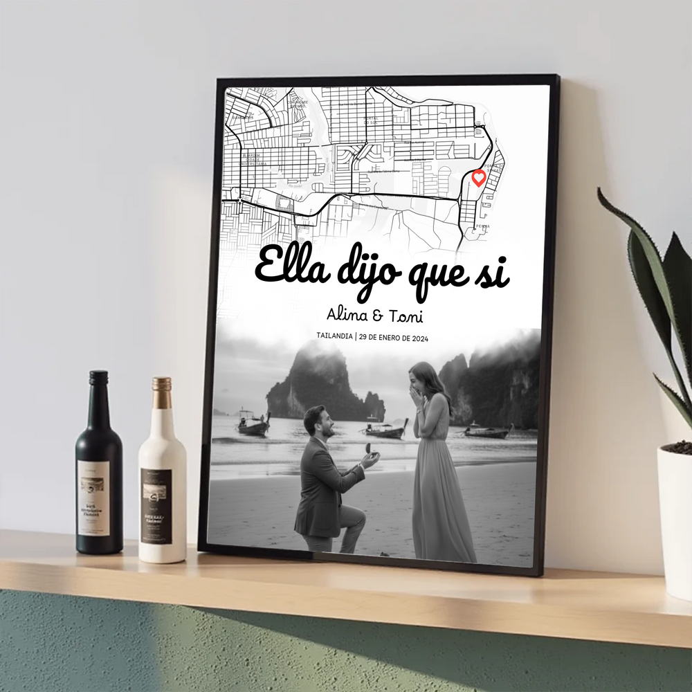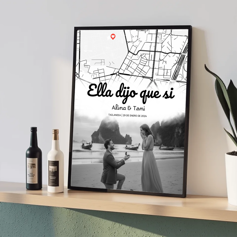 Este cuadro personalizado 30×40 transforma el instante más importante de vuestra historia en una pieza decorativa elegante y cargada de significado. Un diseño que combina mapa del lugar, fotografía, y texto totalmente editable para contar vuestra historia como se merece.